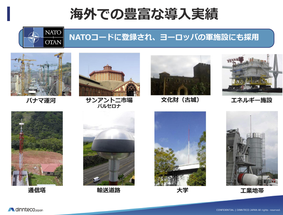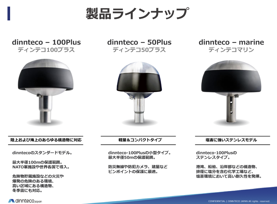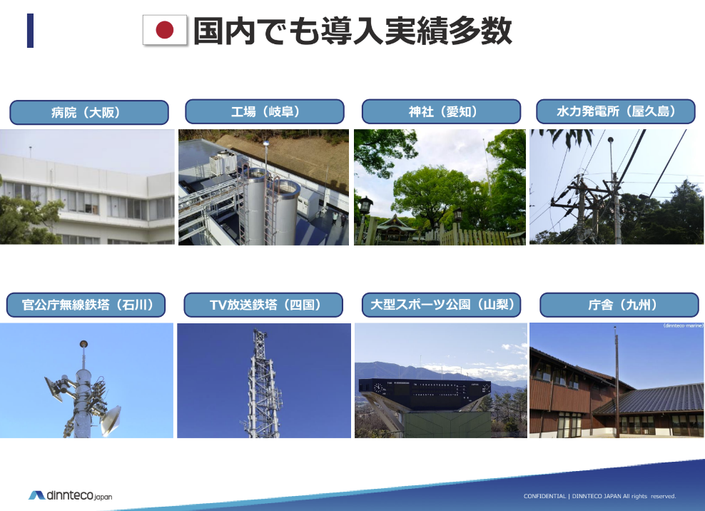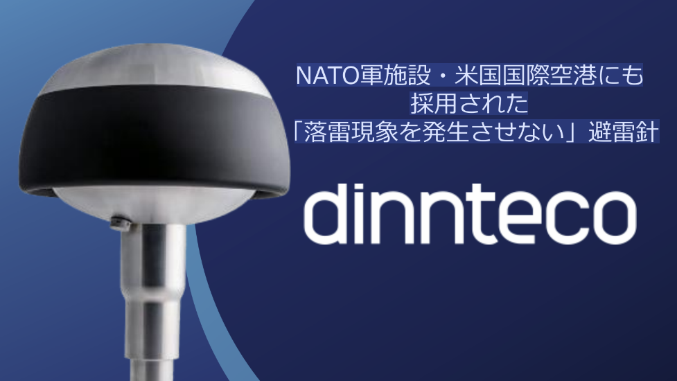 dinnteco-100plusは、従来の避雷針とは異なり、雷を引き寄せずに落雷現象自体を抑制する新しいテクノロジーです。これにより、建物や電子機器へのダメージ、周辺環境への感電被害を防ぎます。スペインやアメリカの空港、NATO軍施設など、国内外で数多くの導入実績があり、その効果が実証されています。日本でも特許を取得し、国内各地で導入されています。さまざまな設置環境に対応する製品ラインナップで、重要施設を雷から守ります。